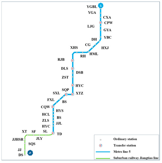 To assist decision-makers in optimizing the service network and formulating station TOD strategies aimed at enhancing network capacity and service quality, this study focuses on two transit lines within Chongqing’s URTN: Line 5 (blue solid line) and the Jiangtiao Suburban Railway (green solid line), as shown in Figure 11. The JTL, with stations 1-2-3-4-5-6-7, is China’s first intercity railway to adopt dual-voltage technology, enabling automatic switching between 25 kV AC and 1.5 kV DC. This enables through-service compatibility with Metro Lines 4, 5, and the Circle Line, allowing trains to run directly between these lines. The M5 Line, with stations 7-8-9-...-38, comprises 32 stations and connects multiple major residential and employment districts in Chongqing’s main urban area.