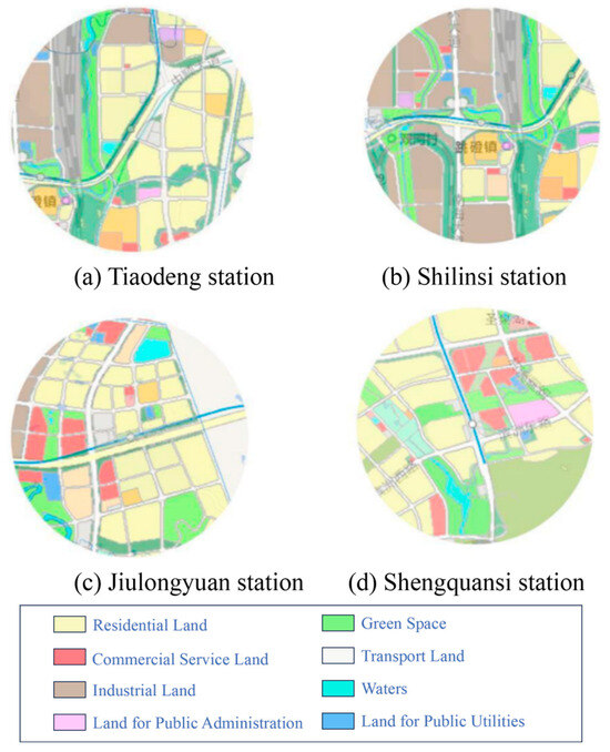 Figure 12 illustrates the current land use conditions around selected stations along the JTL. At present, land development along the JTL remains incomplete. To maximize the JT Line’s role in guiding land development along its corridor, efforts should focus on optimizing land use around stations and enhancing the concentration of residential and employment functions. Based on current regional conditions and planning, Jiangjin High-Speed Railway Station (2), Shuangfu Station (4), Jiulongyuan Station (45), and Shilinsi Station (6) are identified as priority candidate stations for TOD.