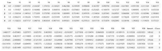 The dataset comprises 30 features: 28 anonymized principal components (V1–V28) derived via PCA (principal component analysis), along with Time and Amount. The target variable Class is binary, with 1 indicating fraud and 0 denoting legitimate transactions. Due to privacy concerns, the original feature labels and semantics were withheld. A snapshot of the first five rows of dataset, sorted based on Time is shown in Figure 1.