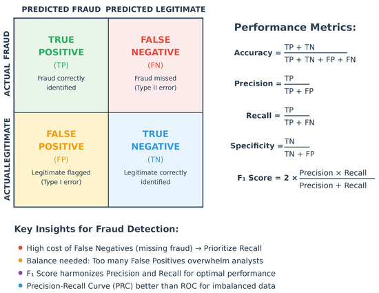 In credit card fraud detection [14], where the cost of missing fraudulent transactions (FN) is significantly higher than false alarms (FP), recall is particularly critical to minimize undetected fraud. However, precision must also be balanced to avoid overwhelming analysts with false positives. The F1-score, which harmonizes precision and recall, is thus a key metric for assessing model performance in such imbalanced scenarios.