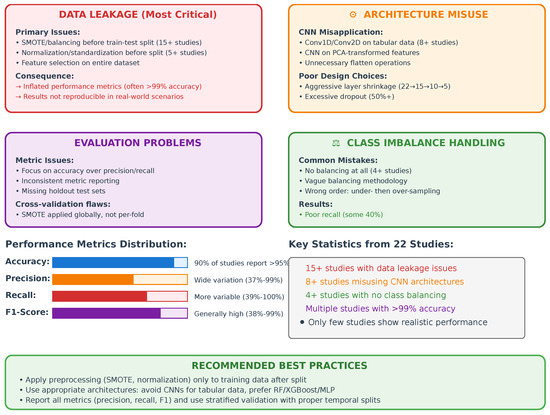 - Data Leakage in Preprocessing: Numerous studies perform critical preprocessing steps (normalization, SMOTE, etc.) before train-test splitting, artificially inflating performance metrics through information leakage.