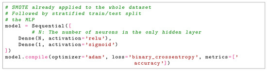 The work presented in [28] utilizes SMOTE prior to applying various machine learning techniques, with the best results achieved by a Random Forest classifier followed by an MLP containing four hidden layers (50 + 30 + 30 + 50 neurons). While the Random Forest model attains an F1-score of 0.964, the MLP’s performance is notably inferior (F1 = 0.792), potentially indicating overfitting or inadequate training. The methodology exhibits significant weaknesses: potential data leakage from performing the train-test split after SMOTE application, unjustified exclusion of 5% of features which might have enhanced the MLP’s performance, and inconsistent results where the performance gap between RF and MLP could indicate either insufficient MLP training or feature mismatch.