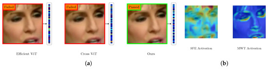 The visual motivation and mechanism analysis of the proposed framework. (a) A comparative analysis of three models with a modified input frame. Each sub-panel displays the input image, a label indicating the prediction outcome (‘Failed’ in a red box or ‘Passed’ in a green box), and an arrow directing attention to a color bar that illustrates the model’s one-dimensional attention allocation across image segments. Warmer hues in the bar signify greater attention weights. (b) An examination of the internal activation maps of the model’s fundamental components. In these maps, warmer colors (e.g., yellow and red) represent higher activation levels, while cooler colors (e.g., blue) indicate lower activation. The left figure illustrates the spatial activation of the Spatial Feature Extraction (SFE) module, whereas the right map exhibits the high-frequency activation of the multi-level wavelet transform (MWT) module.