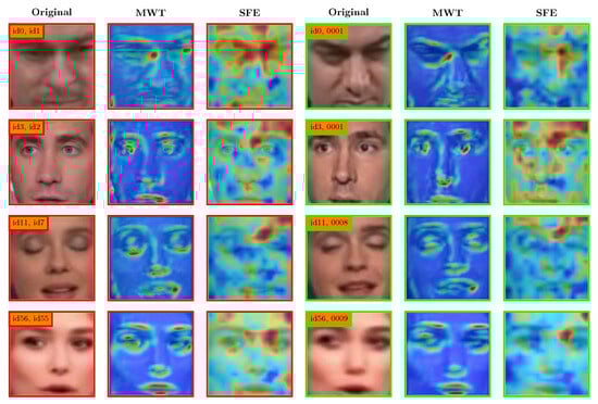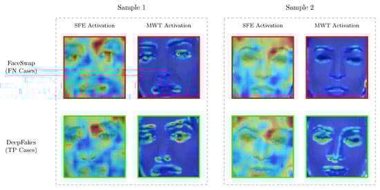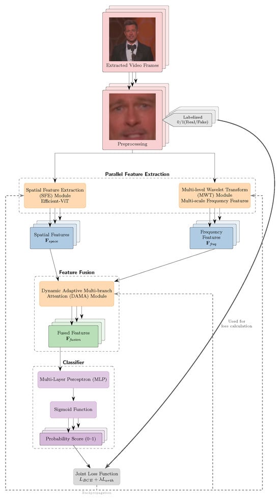 Our methodology is driven by the necessity to address this specific issue. We assert that an optimal detection framework must concurrently “perceive” the image from two complementary perspectives: a global, spatial viewpoint and a local, frequency-oriented viewpoint. Figure 1b illustrates the internal logic of our suggested model through visual evidence. The Spatial Feature Extraction (SFE) module produces a comprehensive activation map that emphasizes the entire facial structure and context. Conversely, the activation of the MWT module is markedly confined, identifying intricate details surrounding the eyes, nose, and mouth—areas where manipulation artifacts are most prone to emerge [37]. The accurate prediction of our model in Figure 1a stems from its capacity to integrate these two unique yet complementary kinds of information.