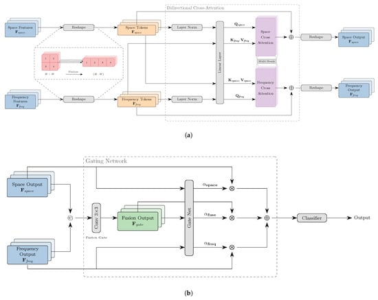 The efficacy of dual modality attention mechanism in fusing spatial and frequency features, as demonstrated by Liu et al. [5], motivated us to develop a frequency-based framework. However, we also noticed that Liu’s work still has some limitations: (1) the interaction between space and frequency features may be restricted by the undirectional attention flow (e.g., only frequency-guided spatial attention in FSA module), resulting in asymmetric information exchange and potentially incurring redundant computational expenses, which is less efficient than Cross Efficient ViT; (2) the static fusion strategy simply concatenates attention outputs without accounting for the dynamic relevance between the two modalities, thereby limiting the adaptability to diverse forgery patterns; (3) The model’s efficiency will markedly improve with the implementation of three levels of fusion attention mechanisms; nevertheless, the computational expense may be too high, since the authors did not provide a comprehensive examination of this cost.