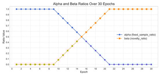 The evolution of and throughout the training process. The two parameters are dynamically adjusted during the training process, with denoting the fixed sample ratio and signifying the novelty ratio. The blue line indicates the value of , whereas the orange line signifies .