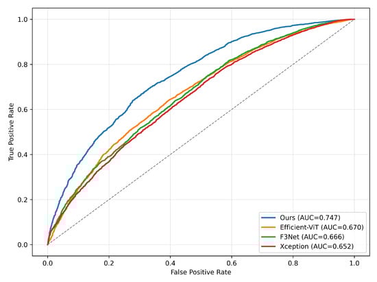 The original FaceForensics++ dataset contains four synthetic methods: Deepfakes, FaceSwap, Face2Face, and NeuralTextures, along with a new method, FaceShifter, introduced subsequent to the release of Rossler et al.’s work [16]. It includes 1000 original videos and 5000 manipulated videos, with each original video processed by all five methods, yielding a total of 6000 videos and over 500,000 frames. They also offer three video quality tiers: raw, c23, and c40, from highest to lowest quality. The c23 and c40 denote different levels of compression applied to the original videos. To imitate the real-world scenario in which numerous videos are not of high clarity, we trained our model using medium-quality videos, i.e., c23, which was also utilized for testing.
