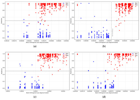 This study also elucidates the pivotal function of . When is excessively low, such as 0.5, the regularization fails to establish a distinct separation, resulting in inferior performance as illustrated in Table 11. As increases, the model attains optimal performance at and , where the distinction between actual and fake samples in Figure 9b,c is most pronounced. This indicates an ideal equilibrium in which the loss function adequately penalizes redundancy caused by forgery, while permitting the model to acquire significant representations. Notably, as is elevated to 2.0, performance commences to deteriorate. This is probably attributable to over-regularization, wherein the robust orthogonal penalty begins to interfere with the beneficial, inherent correlations naturally found in the data, a legitimate issue for this category of loss function.