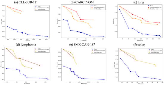 The results summarized in Table 2 are illustrated in Figure 1. For example, a higher number of Pareto-optimal solutions and greater diversity are evident in the figures for the CLL-SUB-111, CARCINOM, lung, lymphoma, SMK-CAN-187, and colon datasets. Additionally, a lower minimum classification error (MCE) is observed across all datasets. The figures for CLL-SUB-111, CARCINOM, lung, and lymphoma also show that the MCE points correspond to solutions with fewer selected features.