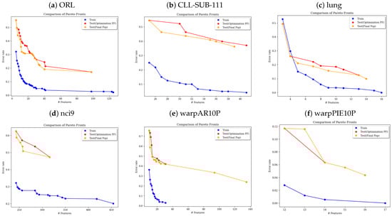 Figure 2 visualizes the test Pareto fronts generated using the NSGA-II algorithm for the ORL, CLL-SUB-111, lung, nci9, warpAR10P, and warpPIE10P datasets. The population-based Pareto front (orange) clearly outperforms the training-based one (red). This performance gap arises because certain high-quality solutions discovered during the evolutionary process are not captured by the training-data Pareto front.
