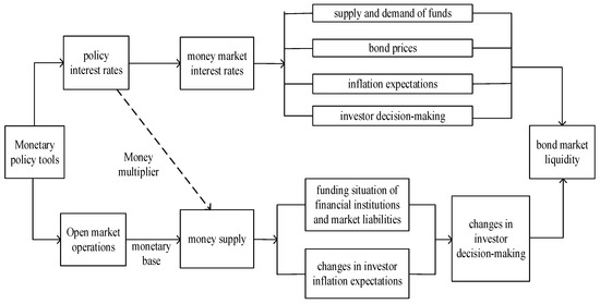 From the perspective of money supply, the money supply is the product of currency base and the money multiplier. The central bank can adjust the money supply by conducting open market operations and changing the reserve requirement ratio, to directly influence the amount of funds available to financial institutions and financial markets. On the one hand, the central bank can alter the supply of the currency base through open market operations, thereby affecting the money supply. On the other hand, changes in the statutory reserve requirement ratio and excess reserve requirement ratio have an impact on the money supply by acting on the money multiplier. In other words, the money supply adjusts the funding situation of financial institutions and the debt side of the market, affects the inflation expectations of investors, alters their decision-making, and ultimately affects the liquidity of the bond market. The transmission mechanism is represented in Figure 1.