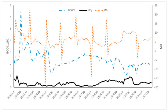 Temporal Evolution of Key Variables. Notes: IBO001 is the price-based monetary policy proxy variable, LIQ is the comprehensive liquidity index of the local bond market, and M0 is the quantitative monetary instrument proxy variable.