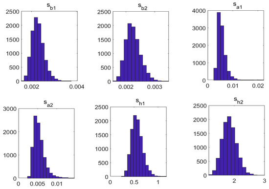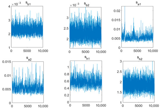The Geweke diagnostic values and ineffective factors are used to test the convergence and effectiveness of the TVP-SV-SVAR model, which are important indicators for evaluating the effectiveness of the MCMC method. According to Table 5, the Geweke diagnostic values of the model parameters are all less than the critical value of 1.96, and the null hypothesis cannot be rejected at the 5% significance level. The Geweke diagnostics significantly converge to the posterior distribution, showing that the parameters of the model significantly converge to the posterior distribution, indicating good convergence of the selected sample in this study. Ineffective factors are mainly responsible for testing effectiveness, with smaller values indicating better sampling efficiency. In Table 5, the values of ineffective factors corresponding to each parameter remain at a relatively low level, with a maximum value of 44.89, indicating that we can obtain at least 223 unrelated sample observations in this state. There is a lot of sample information contained in the observation period, allowing for effective estimation. Therefore, the samples extracted through the MCMC method are effective.