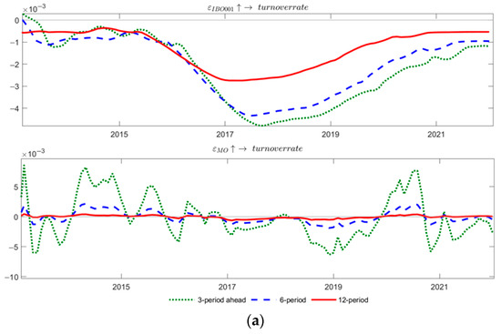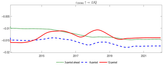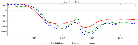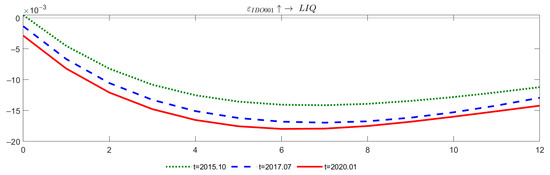 Figure 8 illustrates the pulse response of liquidity in the local bond market to quantitative monetary policy. There is a notable shift in the response around 2015. Before 2015, the pulse response was positive, indicating that an increase in M0 had a positive effect on the liquidity of local bonds. This is consistent with Iwatsubo and Taishi (2018) [34] and Christensen and Gillan (2019) [15], who found that quantitative and qualitative monetary easing (QQE) policies adopted by the government significantly enhanced the liquidity of the bond market. From the perspective of Japan’s policy adjustments, increasing the frequency of purchases, reducing the amount of each transaction, and lowering the variability of the purchase volume have significantly improved market liquidity. After 2015, the pulse response turned negative, indicating that an increase in M0 would lead to a decrease in liquidity in the local bond market.