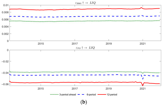 Robustness Checks: Impulse Responses of Liquidity Across Horizons: (a) IBO001, M0, and turnover rate; (b) R001, PO, and LIQ.
