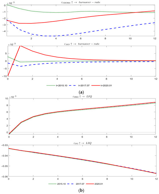 Robustness Checks: Impulse Responses of Liquidity at Different Time Points: (a) IBO001, M0, and turnover rate; (b) R001, PO, and LIQ.