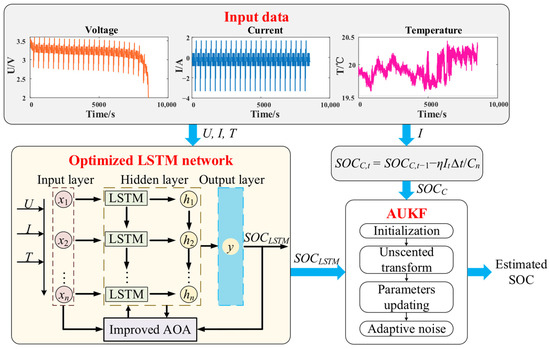 where indicates coulomb efficiency, and , , and represent current, voltage, and temperature at time , respectively. denotes the sampling interval, is the nominal capacity, and are the process and measurement noises with variances and , and and represent the calculated SOC of Coulomb counting and the measured SOC by the AOA-LSTM network, respectively.