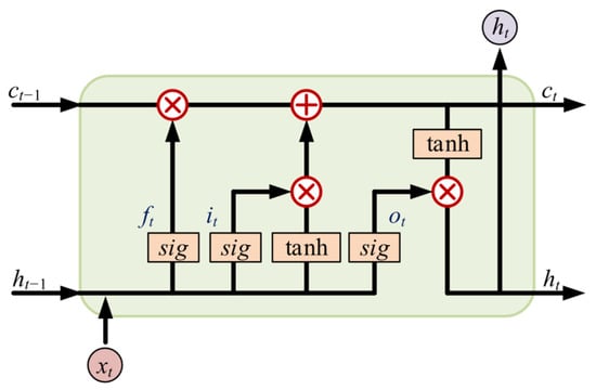 The structure of an LSTM cell is depicted in Figure 2. The LSTM network comprises three main components: the forget gate, input gate, and output gate. These components collaborate to determine whether to retain or forget newly received information. Specifically, the input gate decides how much of the current input data should be saved to the cell state; the forget gate determines how much of the previous cell state should be retained in the current cell state; and the output gate controls how much of the current cell state should be passed on as the current output value. The mathematical expressions of the LSTM unit are as given by (1).