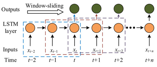The LSTM network takes battery voltage, current, and temperature data as inputs, represented as , and outputs the corresponding SOC value . To enhance the utilization of historical information in the input data, an information enhancement unit was designed, with its architecture illustrated in Figure 3. This unit employs a sliding window technique with a window size of s, reconstructing the input as , where represents the number of time steps.