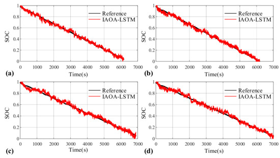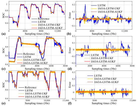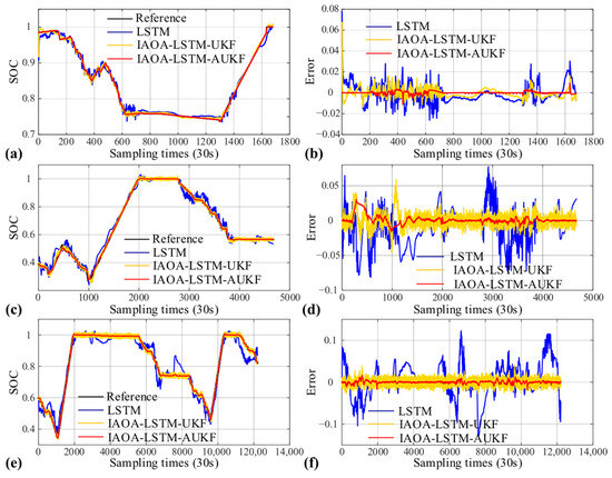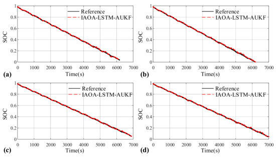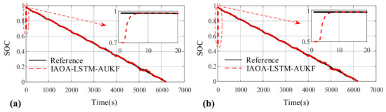 Results of proposed IAOA-LSTM-AUKF method under different initial SOC values: (a) 70%; (b) 50%.