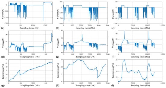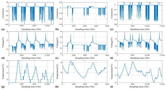 Operating conditions of battery pack 1. (a,d,g) are current, voltage, and temperature in August 2022. (b,e,h) are current, voltage, and temperature in December 2022. (c,f,i) are current, voltage, and temperature in April 2023.