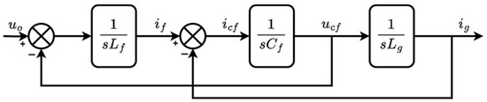 In these equations, stands for the grid’s angular frequency, and indicates the averaged switching functions’ transmission in the dq-frame. The transfer function relating the s-domain currents and input variables in (5) can be derived as follows: