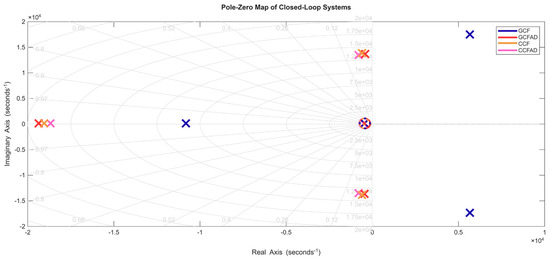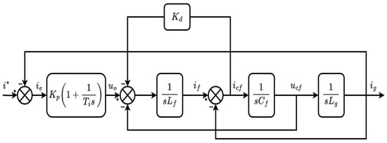 Resonance issues are typically addressed using either passive damping (PD) or active damping (AD) techniques [11,12,13,14]. The PD approach with resistors is straightforward and cost-effective, but it reduces the ability to filter high-frequency harmonics and causes power losses [15], while the AD increases control complexity as it requires additional sensors, which may introduce noise problems because the differentiator amplifies high-frequency signals [5,16]. There are different types of AD techniques [17], such as filter-based, involving placing a digital filter alongside the current controller [18]; weighted average, utilizing the weighted average of the converter side and the grid side currents to prevent resonance [19]; and feedback-based, where the feedback states can be the capacitor current [11,20,21,22,23], the converter current (CCF) [12,13], the grid current (GCF) [14,24,25], or a combination of several different states [26,27,28].