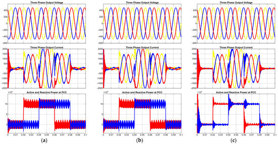 where , , , , , and denote the three-phase converter side current, the grid side current, the grid voltage, the capacitor voltage, and the voltage at neutral points, respectively. The control signals (Sa, Sb, Sc) are indicated by the vector and have values of either 1 or −1. To linearize the above averaged model, the Clarke–Park transformation is commonly applied [29]. In balanced power systems, AC voltages do not exhibit components of zero-sequence. Therefore, the Clarke transformation can be used to convert the abc frame into the αβ frame by applying the following equation: