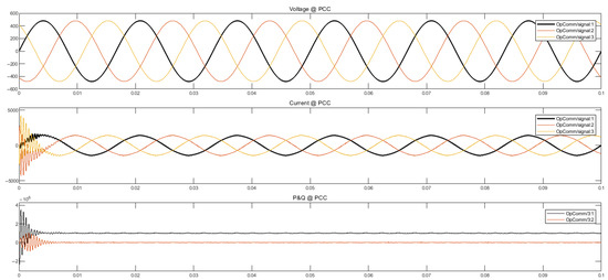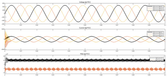 The PLL was employed to estimate the grid angle. It takes the three-phase grid voltages as inputs and provides the angular frequency and grid angle as outputs. As illustrated in Figure 3, the three-phase voltages were first transformed using the Clarke–Park transformation, yielding voltages in the dq-frame. The q-axis voltage was regulated to remain at zero by comparing it to a zero reference. To eliminate the q-axis component, a PI controller was implemented within the feedback loop to adjust the dq-frame accordingly [1].