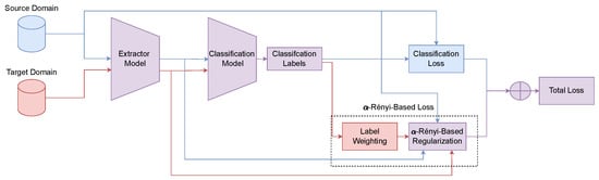 2.3. Domain Adaptation with -Rényi Entropy-Based Label Weighting and Regularization