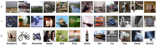 - ImageCLEF-DA: This is a standard benchmark for unsupervised domain adaptation, organized as part of the ImageCLEF evaluation campaign. It comprises 12 common object classes shared across three distinct visual domains: Caltech-256 (C), ImageNet ILSVRC 2012 (I), and Pascal VOC 2012 (P), see Figure 3. Each domain contains 600 images, with a balanced distribution of 50 images per class [72]. All images are resized to pixels.