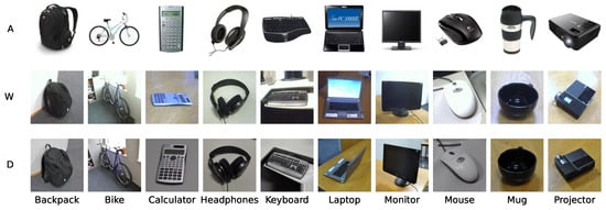 - Office-31: It consists of 4110 images across 31 object classes, sourced from three domains with distinct visual characteristics: Amazon (A), which features centered objects on a clean, white background under controlled lighting; Webcam (W), containing low-resolution images with typical noise and color artifacts; and DSLR (D), which includes high-resolution images with varying focus and lighting conditions [73]. Here, we selected a subset of ten shared classes (see Figure 4).