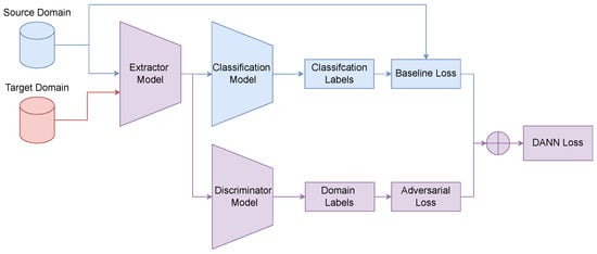 - DANN: The Domain-Adversarial Neural Network (DANN) [78] introduces a domain discriminator, , which is trained to distinguish source features from target ones, see Figure 6. The discriminator is implemented as a multi-layer neural network, where a predicted label of 1 indicates source domain membership, and 0 indicates target domain membership. Moreover, the feature extractor is simultaneously trained to produce features that fool the discriminator, thereby learning domain-invariant representations via a Gradient Reversal Layer (GRL). The overall objective is a minimax game:where represents a trade-off hyperparameter. The domain adversarial loss is the binary cross-entropy for domain classification, where source samples are assigned domain label 0, and target samples label 1.