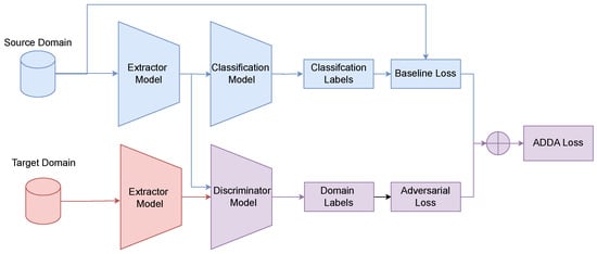 - ADDA: The Adversarial Discriminative Domain Adaptation (ADDA) framework [79] separates the training into two distinct stages, see Figure 7. First, a source feature extractor and the classifier are trained using the supervised loss (see Equation (24)). In the second stage, the parameters of and are frozen. Then, a new target feature extractor, (initialized with the weights in ), is then trained to fool the domain discriminator in a minimax game (see Equation (25)). The objective is to align the target feature distribution with the fixed source feature distribution.