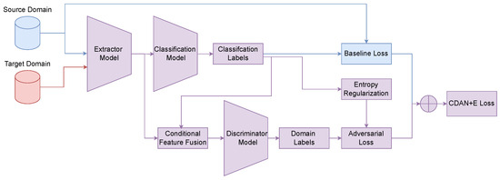 Figure 8. CDAN+E framework for unsupervised domain adaptation. Blue: source; Red: target; Purple: shared.Specifically, the Shannon entropy is computed for the predictions of all samples in a batch. This entropy value is then used in two ways. First, it is passed through a GRL, which implicitly creates an entropy minimization objective for the feature extractor, encouraging it to produce more confident (low-entropy) predictions. Second, the entropy is transformed into a sample-wise weight, as follows:This weighting scheme gives greater importance to samples with confident predictions (low entropy), thereby focusing the adversarial alignment on well-structured regions of the feature space. The resulting weighted conditional adversarial loss, , is then defined as follows:where both and are calculated according to Equation (26). The total loss for the CDAN+E framework can thus be expressed as the combination of the supervised loss and this integrated adversarial and entropy-regularized objective (see Equation (25)).
