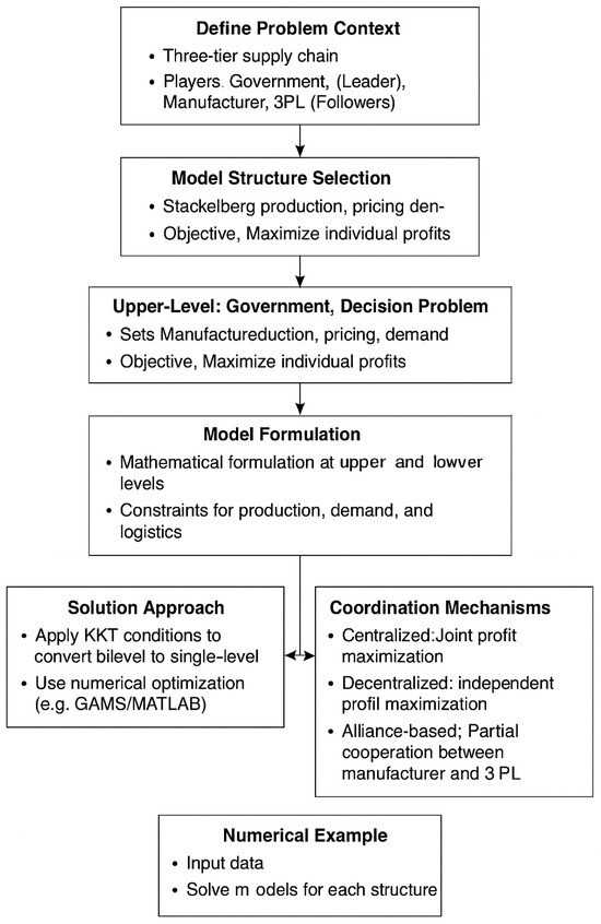 In conclusion, this methodological design provides a theoretically grounded and practically implementable approach to analyzing government intervention in global supply chains. It captures the multi-level strategic behavior of actors, enables rigorous policy testing, and offers insights for decision-makers on how to design subsidy schemes that promote efficiency, cooperation, and sustainable logistics adoption [13,24,25,26,27]. To enhance clarity, the research methodology is depicted in the form of a flowchart, as shown in Figure 2.
