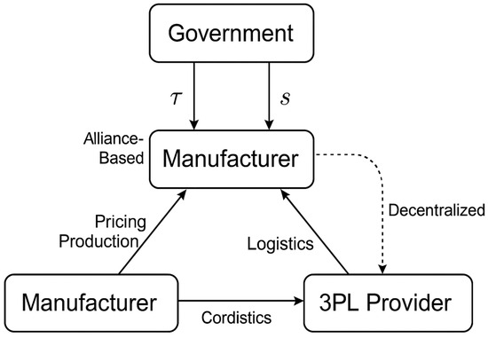 This study models strategic interactions in an upstream supply chain involving a manufacturer and a third-party logistics (3PL) provider, influenced by government-imposed tariffs () and subsidies (s). To evaluate the effects of fiscal policies and coordination mechanisms, we consider three structural regimes. In the centralized regime, the manufacturer and 3PL coordinate to jointly optimize pricing (p), quantity (q), logistics fees (r), and effort level (e) to maximize overall system profit under fixed government policy [24]. In contrast, the decentralized regime follows a hierarchical Stackelberg game: the government first sets and s; the 3PL then selects r and e to maximize its own profit; finally, the manufacturer responds by choosing p and q [25]. The alliance-based structure serves as an intermediate scenario, where the manufacturer and 3PL form a strategic alliance and jointly determine while adapting to government-imposed fiscal instruments [17,18]. This bilevel framework allows for comparative analysis of policy effectiveness and coordination efficiency across different structural settings.