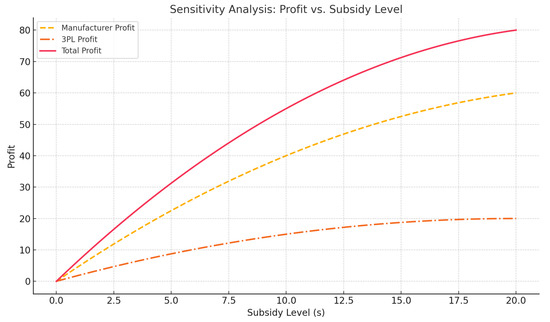 For solution implementation, the entire model is encoded in GAMS (version 38.1.0) and Pyomo (https://www.pyomo.org/). A numerical simulation is conducted using empirically plausible parameter values such as , , , , , and . The solution outputs include optimal subsidy rates, prices, logistics fees, and the resulting profits for each stakeholder. Additionally, comparative statics are performed to examine how variations in subsidy s, tariff , and price sensitivity b influence equilibrium outcomes.