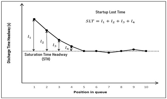 The discharge time headway is the passage time between two consecutive vehicles passing a stop line. The values for the first few discharge time headways have a descending trend until they reach a stable condition, where the two consecutive headways do not differ significantly. SLT is defined as the sum of the additional time taken to start up the vehicle, which extends to more than the STH, from the first discharge time headway to the point where the discharge time headway becomes stable. STH is the discharge time headway at which a stable condition is reached (Figure 1). Saturation flow rate (SFR), an essential parameter for computing the capacity of a signalized intersection, is calculated as the reciprocal of STH, with vehicles per hour per lane (veh/h/ln) as its unit.