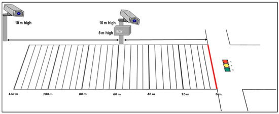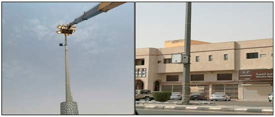 Video data collection was conducted at the selected approaches of both intersections using two synchronized cameras per site. The primary camera focused on the stop line and signal heads, while the secondary camera captured the approach from an upstream perspective (Figure 3). Both video feeds were synchronized and displayed concurrently on a single monitoring screen. To facilitate spatial analysis, grid lines spaced at 5 m intervals, extending 120 m upstream from the stop line, were digitally superimposed on the footage using physical pavement markings as reference points. Monitoring occurred during daylight hours (dawn to dusk) over four consecutive days. Data collection specifically targeted through movements, with analysis restricted to queues of 7–10 small-to-medium-sized vehicles. Equipment was mounted on light columns along the central median island, housing both cameras and a digital video recorder (DVR). Given the high ambient temperatures during the late-July data collection period in this hot climate region, custom-designed enclosures incorporated reverse-flow fans to maintain internal air circulation and prevent thermal damage to recording equipment (Figure 4).