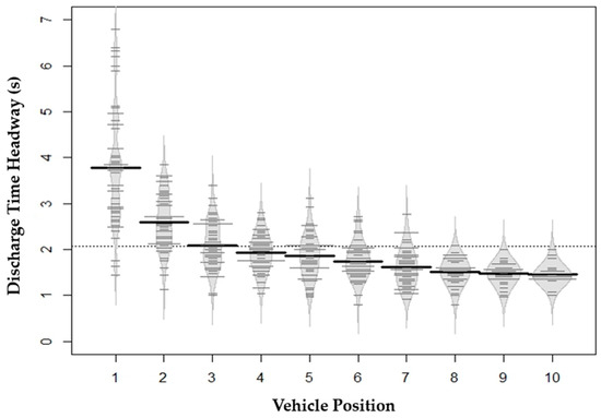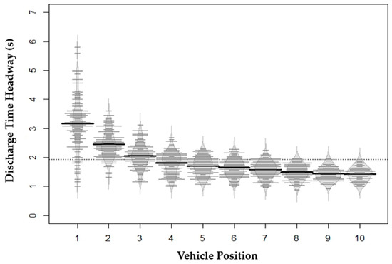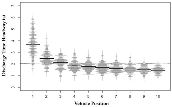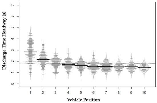 Figure 8 shows the observed discharge time headways at the intersection with an SRLC and a TSCT. The means of the first three discharge time headways were approximately 3.16, 2.45, and 2.05 s, respectively. Similarly, the decreases in discharge time headway mean and distribution spreads for the first three positions were larger than those in the discharge time headway means for the higher positions, falling below the overall mean of 1.93 s. However, Figure 8 shows discharge time headways that are higher than those in Figure 7 but lower than those in Figure 5 and Figure 6.