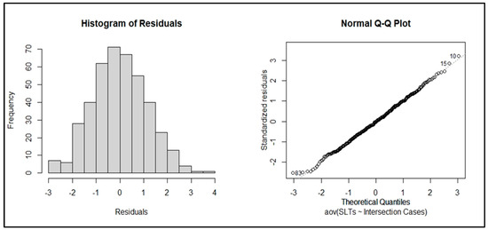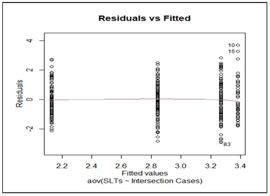 One-way ANOVA was performed on the calculated SLTs to determine if the means were significantly different among intersection cases, as explained in the Study Method Section. Table 3 shows the output for this model. One-way ANOVA assumes that the residuals are normally distributed and the variance of the observations is approximately the same in each intersection case. The residuals are approximately normally distributed, as shown in Figure 9. The histogram appears to be a normal distribution, and the Q-Q plot shows that all the points fall approximately along the reference line. Moreover, the skewness and kurtosis of the residuals are 0.10 and 2.9, respectively, which are very close to the 0.00 and 3.00 skewness and kurtosis of the normal distribution, respectively. As for the homogeneity of variances, Figure 10 shows no evident pattern between the residuals and the fitted values, indicating that homogeneity of variances can be roughly assumed; therefore, the ANOVA assumptions were approximately met.