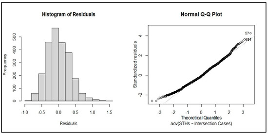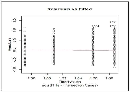 One-way ANOVA was performed on the observed STHs to determine if the means were significantly different among the intersection cases, as explained in the Study Method Section. Table 4 shows the outputs of the model. The assumption of normality was roughly met, as shown in Figure 11. The histogram resembles a normal distribution, and the Q-Q plot shows that all the points fall approximately along the reference line. Moreover, the skewness and kurtosis of the residuals are 0.38 and 3.12, respectively, which are close to the 0.00 and 3.00 skewness and kurtosis of the normal distribution, respectively. Figure 12 shows no evident pattern between the residuals and the fitted values, indicating that homogeneity of variances can be roughly assumed; therefore, the ANOVA assumptions were approximately met.