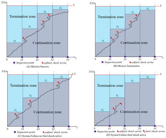 A graph illustration of Theorem 1 is presented in Figure 1, which summarizes four possible exclusive scenarios under this threshold-constriction termination policy: (A) mission success, (B) proactive mission termination, (C) unexpected failure attributed to degradation accumulation, and (D) unexpected failure due to fatal shock. At each inspection, the system’s degradation level is compared with a corresponding dynamic optimal mission risk control threshold to determine whether to continue the mission. In Figure 1A, the degradation trajectory always remains below the non-decreasing termination threshold, leading to successful completion. Figure 1B reveals that the degradation level exceeds the dynamic threshold at a certain inspection, triggering an instant mission termination to avert severe failure consequences. Figure 1C,D, in contrast, state two distinct system malfunction scenarios stemming from either excessive degradation or fatal shock, prior to mission termination. This set of figures visually discloses the dynamics of the risk-aware termination strategy driven by both mission duration and real-time degradation, which provides an explicit and intuitive termination suggestion for managers.