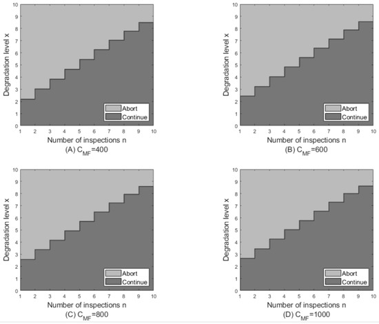 In contrast to the gradually increasing mission abort threshold policy described earlier, this policy assumes a fixed mission abort threshold . That is, at each inspection epoch, if the system’s degradation level exceeds a fixed abort threshold, a mission abort action is executed. Under this policy, the value function becomes as follows: