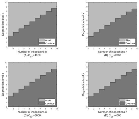 In Figure 2, the risk control chart is divided into two parts by a monotonic threshold: the upper part where the abort action is performed, and the lower half where the system continues to perform the mission. The monotonicity of the threshold corresponds to Theorem 1, that as the mission progresses, the decision-maker becomes more tolerant of the health status. Next, we explored the control chart variation regarding cost. Under a fixed system failure cost, as the cost of mission failure increases, the area of mission termination becomes smaller; that is, decision-makers will take more radical measures to try to complete the mission and have a higher tolerance for the health of the system. This is reflected by a shrinking upper section in the diagram.