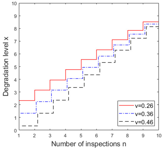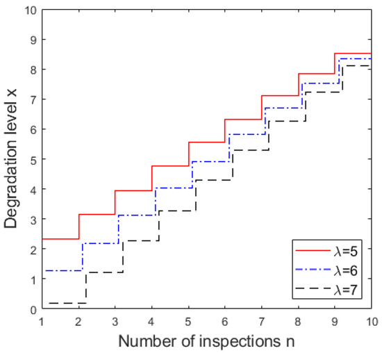 Evidently, is a constant whose value is not associated the degradation severity x. Accordingly, it can be proved that is also non-decreasing in x, and is non-decreasing in x for any value of shock number n. Additionally, it is evident from Equation (7) that is a non-decreasing function with respect to x. Summing up all these monotonicity verifies that the value function is a non-decreasing function of x.