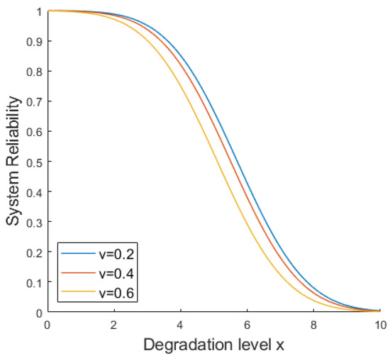 Figure 6 depicts the variation in system reliability with respect to degradation for different drift parameters of the Wiener process. A larger drift parameter indicates a faster progression of the system toward the degraded state. Consequently, for the same level of degradation, the system is more likely to reach the failure threshold sooner. As a result, an increased drift parameter corresponds to a higher probability of system failure, thereby leading to a reduction in system reliability. This highlights the critical impact of the drift parameter on system performance and the importance of accounting for it in reliability assessments.