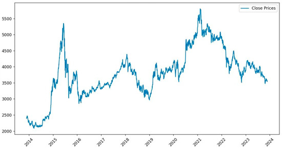 This study focuses on the CSI 300 Index and utilizes a dataset comprising 2436 trading days from 25 November 2013, to 24 November 2023. The fundamental indicators were sourced from the Choice financial terminal, while the technical indicators were derived through computational methods. A multidimensional feature set with 13 variables was constructed, encompassing both fundamental trading indicators and technical analysis metrics. The fundamental indicators include: Open, High, Low, Close, Price Change, and Trading Volume, which reflect market price levels and trading activity. The technical indicators comprise: the Moving Average Convergence Divergence (MACD), the Stochastic Oscillator (KDJ, including K, D, and J lines), the Relative Strength Index (RSI), the Bias Ratio (BIAS), the Williams %R (Willr), the On-Balance Volume (OBV), and the Rate of Change (ROC), which together capture market trends, volatility intensity, and overbought/oversold signals, thereby enhancing the model’s ability to identify price dynamics.