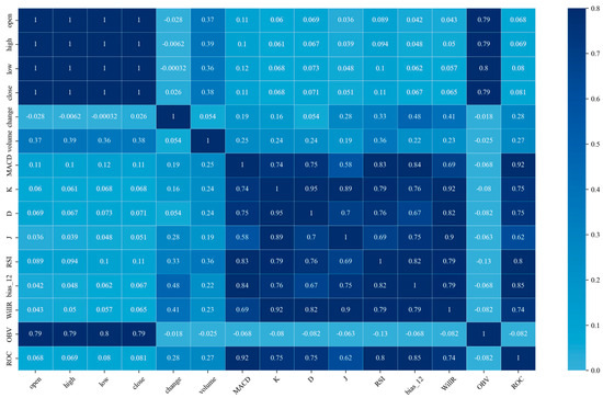 Based on heatmap visualization analysis (see Figure 3), the closing price of the CSI 300 Index shows a strong positive correlation with the opening price, highest price, and lowest price, with correlation coefficients all exceeding 0.99. This indicates a high degree of consistency among these price-related indicators in terms of trend movement. In addition, the closing price exhibits significant co-movement with the On-Balance Volume (OBV) and trading volume, with correlation coefficients of 0.79 and 0.38, respectively. Also, substantial cross-correlations are observed between technical indicators and trading indicators, revealing a high level of information redundancy and multicollinearity in the original feature space. Such characteristics may adversely affect the stability and computational efficiency of downstream models.